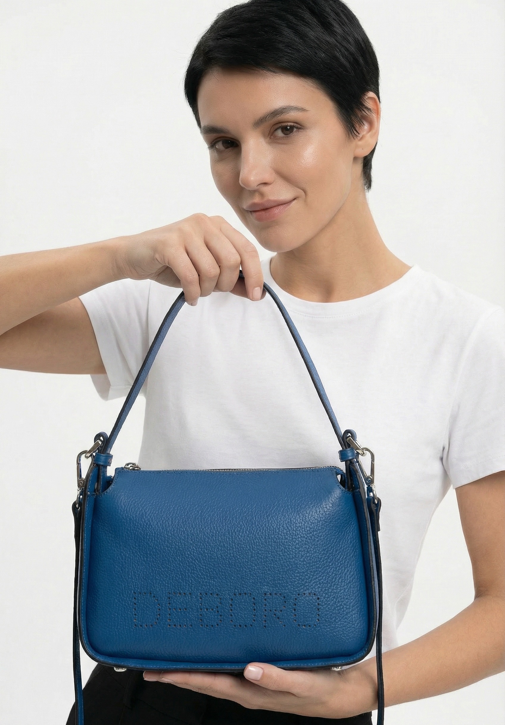 Элегантная женская сумка из натуральной зернистой кожи насыщенного синего цвета Deboro 30790 синяя гуашь выглядит стильно и современно. Компактная форма, слегка вытянутая по горизонтали достаточно мягкая, но при этом держит форму. На передней стороне - аккуратная перфорация с логотипом бренда.