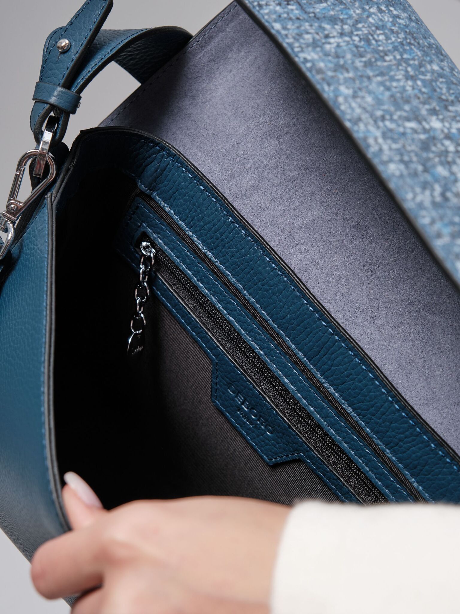 Водонепроницаемая подкладка сбережет изделие от повреждений. На внутренней стенке клапана отделка из натуральной замши, которая прекрасно оттеняет общий стиль и придает особый шарм. Клапан на магнитах обеспечивает быстрый доступ к нужным вещам. Внутренний карман на молнии позволит разместить ценные вещи.